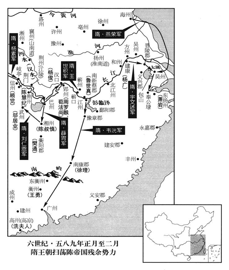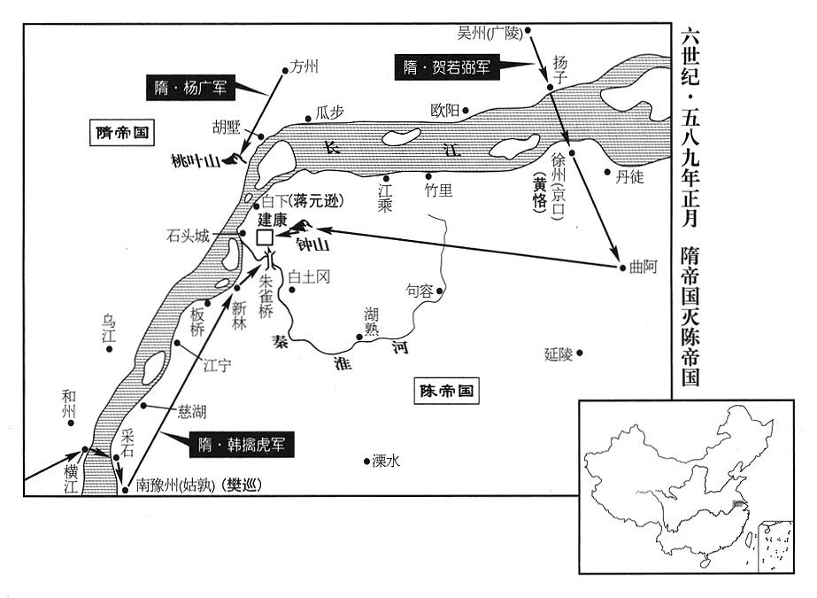 当天,隋帝国(首都大兴“〔陕西省西安市〕”)吴州军区(总部设广陵“〔江苏省扬州市〕”)总司令(吴州总管)贺若弼从广陵(吴州州政府所在县·江苏省扬州市)率军渡过长江。