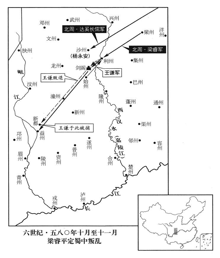 13、北周帝国益州军区(总部设成都“〔四川省成都市〕”)总司令王谦,也反抗丞相杨坚,集结巴蜀所有军队,攻击始州(普安·四川省剑阁县)。新任军区总司令梁睿进抵汉川(汉川就是汉中“〔陕西省汉中市〕”,因杨坚的老爹名杨忠,“中”“忠”同音,所以改名。这种“避讳”文化至为有趣,世有杨忠,就再不准有忠臣),不能前进,杨坚即命梁睿当大军元帅,讨伐王谦。