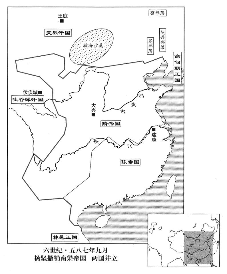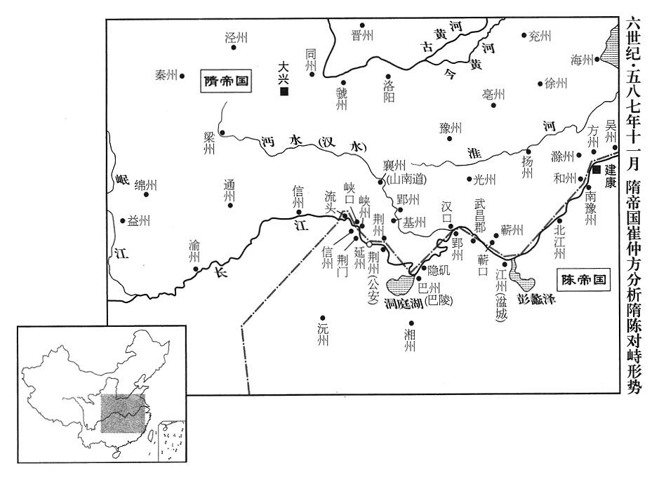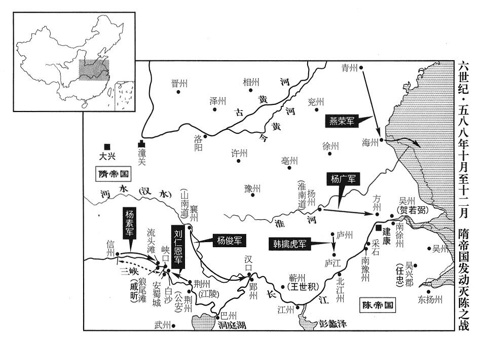 5、十月二十八日,隋帝杨坚因各地动员完成,前往皇家祖庙,向祖先焚香禀告。命晋王杨广、秦王杨俊、清河公杨素都当大军元帅。杨广自六合(方州·江苏省六合县)出发,杨俊自襄阳(襄州·湖北省襄樊市)出发,杨素自永安(信州·重庆市奉节县)出发,荆州(江陵·湖北省江陵县)州长刘仁恩自江陵出发,蕲州(蕲春·湖北省蕲春县)州长王世积自蕲春出发,庐州军区(总部设合肥“〔安徽省合肥市〕”)总司令(庐州总管)韩擒虎自庐江(安徽省庐江县)出发,吴州军区(总部设广陵“〔江苏省扬州市〕”)总司令(吴州总管)贺若弼自广陵出发,青州军区(总部设东阳“〔山东省青州市〕”)总司令(青州总管)弘农(河南省灵宝市)人燕荣自东海出发(率舰队渡东海南下)。计出动作战司令(总管)九十人、士卒五十一万八千人,都受晋王杨广指挥。东接东海(海州·江苏省连云港市),西接巴蜀,旌旗连接,船舰相衔,横亘数千里。杨坚命国务院左执行长(左仆射)高颎当晋王杨广大军元帅府秘书长(晋王元帅长史),右执行长(右仆射)王韶当军政官(司马),军中一切事务,都由二人裁决;所有处分调配,没有一点阻碍。