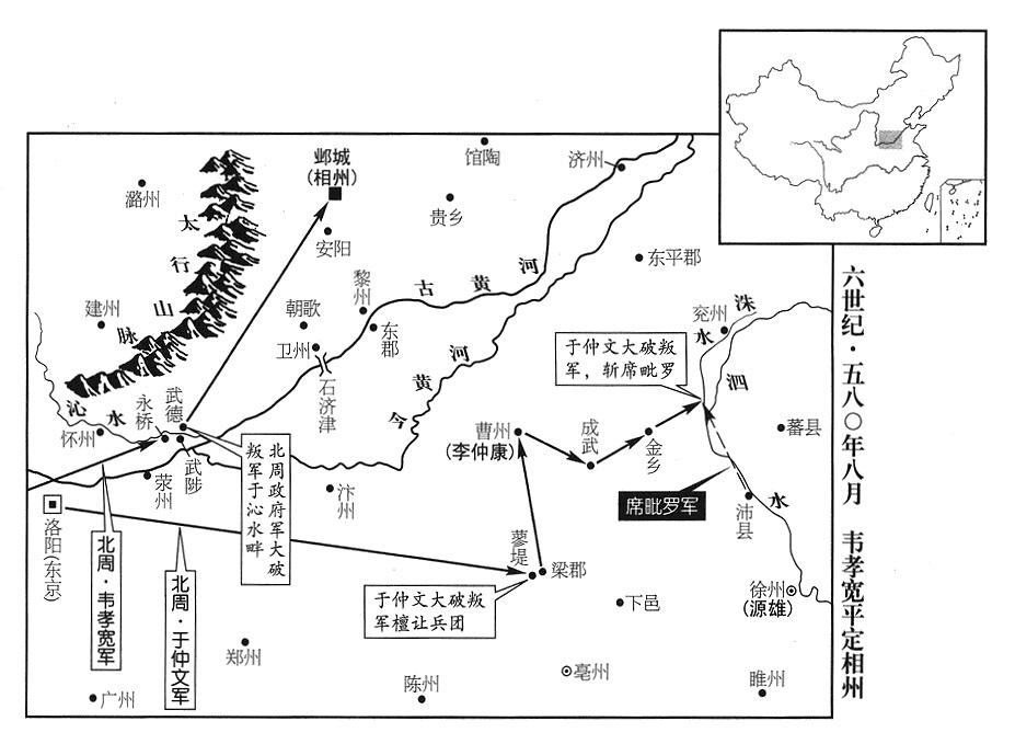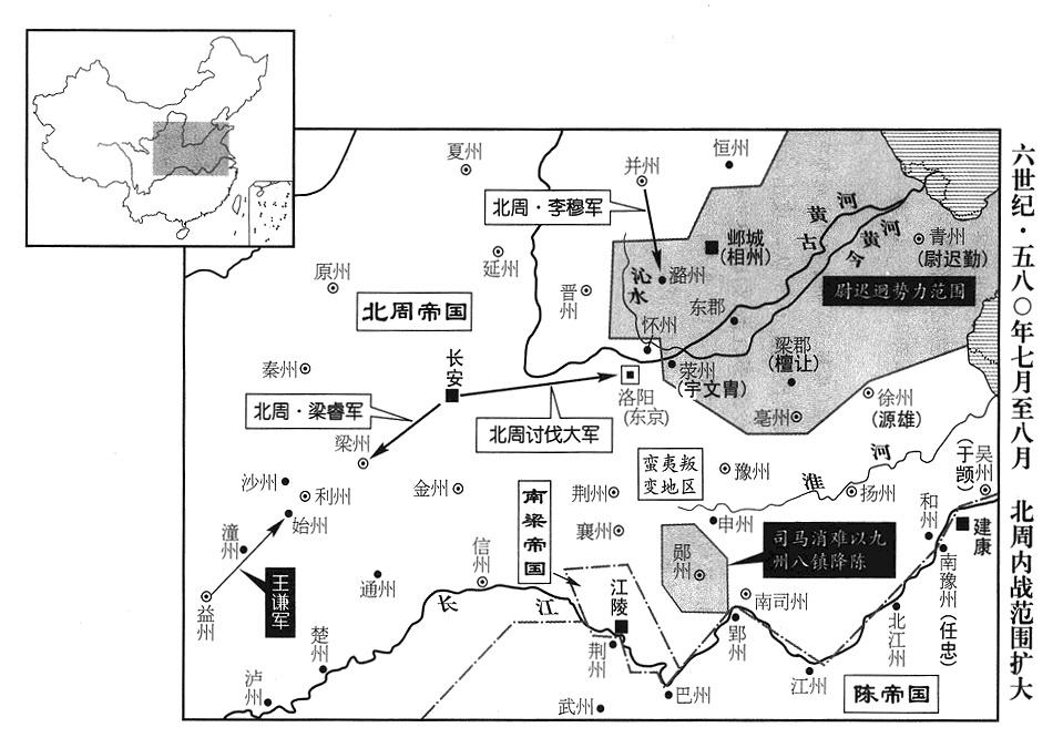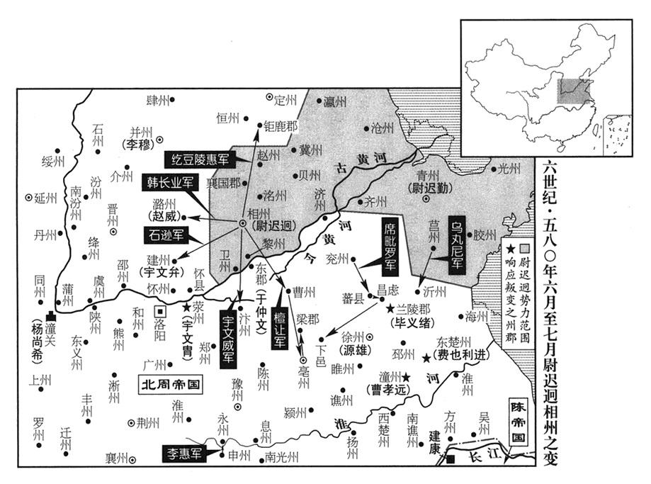 11、北周帝国青州军区(总部设东阳“〔山东省青州市〕”)总司令(青州总管)尉迟勤,是反抗军首领、蜀公尉迟迥的侄儿。最初接到尉迟迥的信时,立即奏报中央,但不久仍响应伯父的号召。尉迟迥管辖(相州军区)的相州、卫州(枋头城·河南省淇县东南淇门渡)、黎州(黎阳·河南省浚县)、络州(广平·河北省永年县东南旧永年镇)、贝州(武成·河北省清河县西北)、赵州(广阿·河北省隆尧县)、冀州(信都·河北省冀州市)、瀛州(赵都军城·河北省河间市)、沧州(饶安·河北省盐山县西南)以及尉迟勤管辖(青州军区)的青州(东阳)、齐州(历城·山东省济南市)、胶州(东武·山东省诸城市)、光州(东莱·山东省莱州市)、莒州(团城·山东省沂水县)等十四州,全都响应,部众数十万人;声势所及,荥州(虎牢·河南省荥阳市汜水镇西)州长邵公宇文胄、中州(义阳·河南省信阳市)州长李惠、东楚州(宿预·江苏省宿迁市)州长费也利进(费也,复姓)、潼州(临潼·安徽省泗县)州长曹孝远,各在本州起兵响应。徐州军区(总部设彭城“〔江苏省徐州市〕”)审理官(司录)席毗罗据守兖州(瑕丘·山东省兖州市),前东平郡郡长毕义绪据守兰陵(山东省枣庄市东南峄城镇),也都起兵响应。