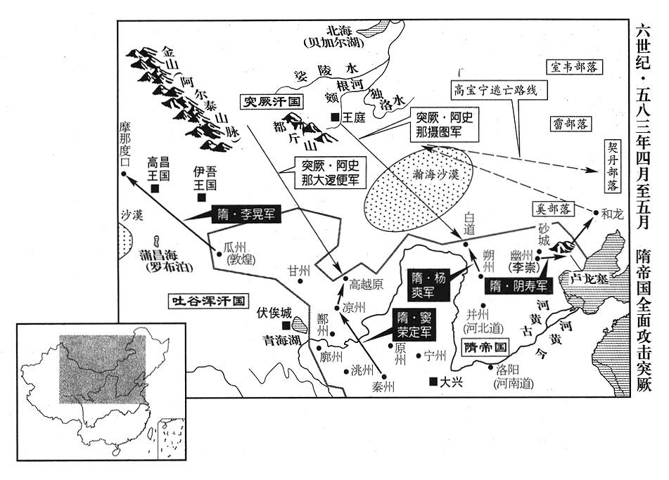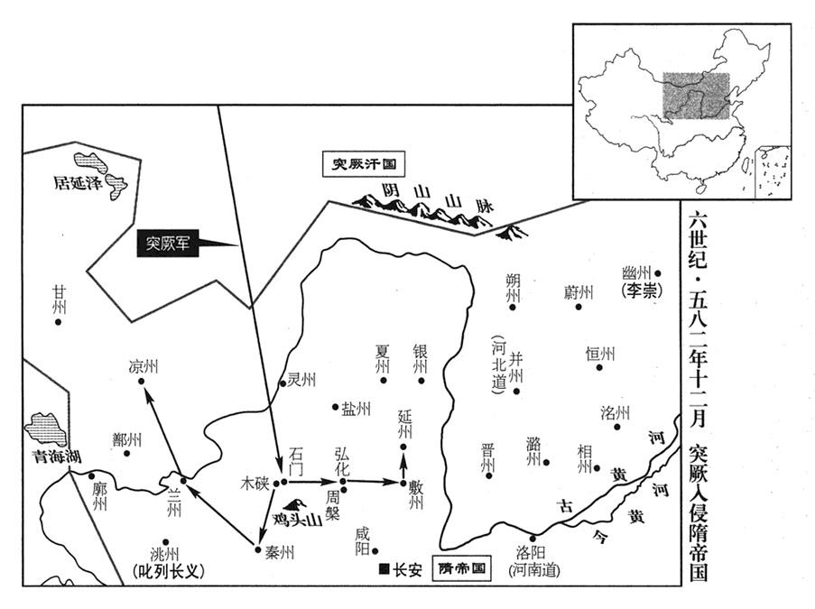 15、隋帝杨坚命农林部副部长(司农少卿·正四品上)崔仲方征发民夫三万人,在夏州(岩绿·陕西省靖边县北白城子)、灵州(回乐·宁夏灵武市)修筑长城,东到黄河,西到绥州(上县·陕西省绥德县),绵延七百里,用以遏阻北方匈奴部落(指突厥汗国)南侵(以各地地望,长城所在应是“西到黄河“〔灵州〕”、东到绥州”才对,灵州与绥州两地航空距离三百五十千米)。