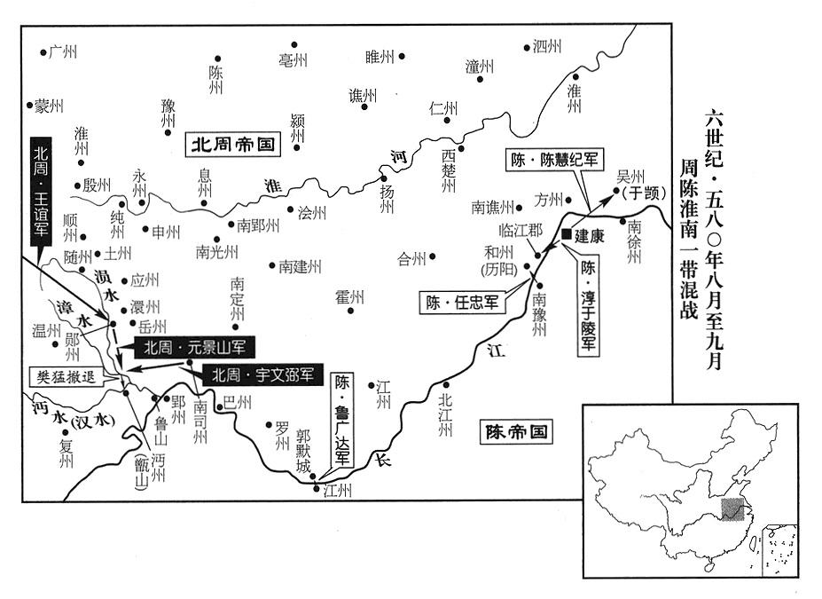 八月七日,陈顼命镇西将军樊毅当沔汉(汉水流域)军区司令官(督沔汉诸军事),南豫州(姑孰·安徽省当涂县)州长任忠率军攻击历阳(安徽省和县),超武将军陈慧纪当前锋司令官(前军都督),攻击南兖州(广陵·江苏省扬州市。北周称吴州、东广州)。