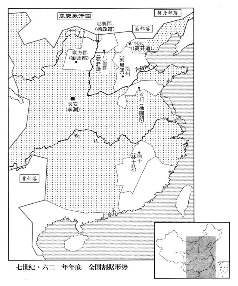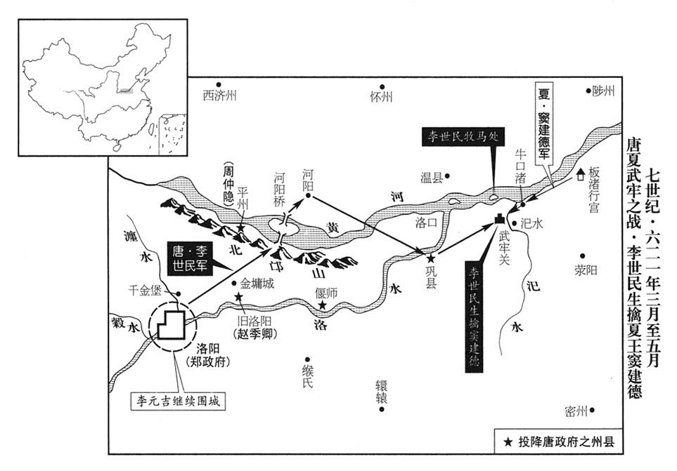 2、李世勣(徐世勣)密谋:一旦夏王窦建德(首都洺州“〔河北省永年县东南旧永年镇〕”)抵达河南(黄河以南),就偷袭他的大营,诛杀窦建德,希望找到老爹李盖(徐盖),连同夏国国土,一起回归唐政府(首都长安)。不巧,窦建德的妻子曹皇后生产,延误很久,不能抵达。