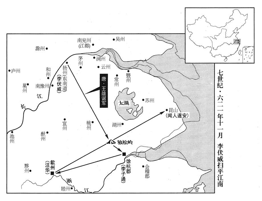 于是李伏威所辖地区,包括全部淮南、江东(太湖流域及钱塘江流域),南到南岭(仙霞岭),东到大海(东海)。王雄诞因军功被任命当歙州军区(总部设安徽省歙县)总司令(歙州总管),封宜春郡公。
