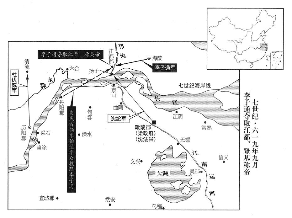 11、武康(浙江省德清县西武康镇)人沈法兴,世代是郡中著名的大族,有数千家之多。沈法兴当吴兴郡(浙江省湖州市)郡长,听到宇文化及诛杀杨广消息,遂聚众起兵,借口讨伐宇文化及(《新唐书·沈法兴传》:沈法兴正在外攻击东阳郡“〔浙江省金华市〕”变民首领楼世幹),回军到乌程(吴兴郡郡政府所在县),已拥有精锐士兵六万人,遂进攻馀杭郡(浙江省杭州市)、毗陵郡(江苏省常州市)、丹阳郡(江苏省南京市),全都攻克;占领江表(太湖流域及钱塘江流域)十余郡,自称江南道(长江以南)总司令官(大总管),代表皇帝行使职权,设置文武百官。