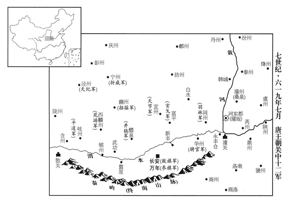 50、秋季,七月,唐政府开始设立十二军,把关内各征兵府,分别配备给各军,各军都使用天上星辰的名字(参旗军“〔万年道·首都长安东半城〕”、鼓旗军“〔长安道·首都长安西半城〕”、玄戈军“〔富平道·陕西省富平县〕”、井钺军“〔醴泉道·陕西省礼泉县〕”、羽林军“〔同州道·陕西省大荔县〕”、骑官军“〔华州道·陕西省华县〕”、折威军“〔宁州道·甘肃省宁县〕”、平道军“〔岐州道·陕西省凤翔县〕”、招摇军“〔豳州道·陕西省彬县〕”、苑游军“〔西麟州道·陕西省麟游县〕”、天纪军“〔泾州道·甘肃省泾川县〕”、天节军“〔宜州道·陕西省耀县〕”),各道征典府称“车骑府”,每军设将军一人、副将军一人,由有威望的将领担任,平时耕田,战时出征。于是兵强马壮,所向无敌。