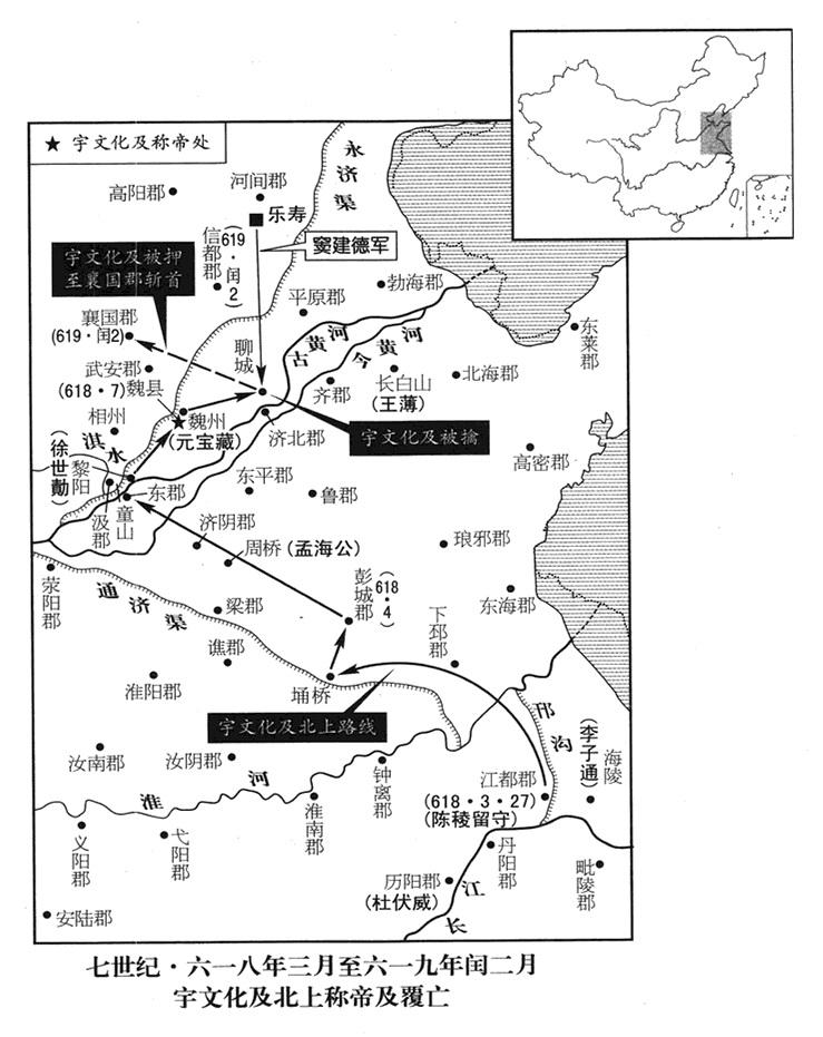 18、隋王朝流亡政府(四任帝杨浩)大丞相宇文化及,率部众十余万,占据六宫,豪华奢侈,跟杨广时代完全相同。宇文化及每次在御帐中,面向南方而坐(只有帝王才面向南方而坐),有人进帐请示时,他一句话也不说,直等到下班离帐,才把各种请示文件取出来,跟唐奉义、牛方裕、薛世良、张恺等一起讨论裁决。而把隋帝杨浩交给国务院(尚书省),由国务院派卫士十余人严密看管;另派一位助理员(令史)送文件教杨浩签字,文武百官也不向杨浩朝见。抵达彭城郡后,运河不通(通济渠经彭城郡南境的埇桥“〔安徽省宿州市〕”),于是,再向民间搜刮车辆和牛,共两千辆,用来装载宫女、珠宝,而武器铠甲,则全由士卒自己背负,道路遥远,身心疲惫,大家开始怨恨。
