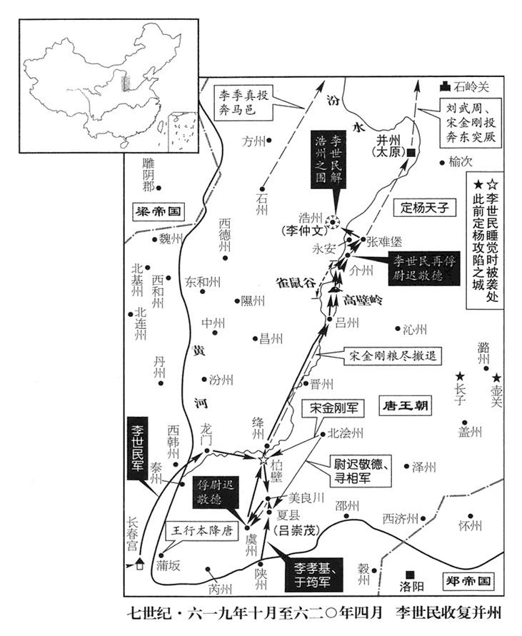 78、唐政府陕州军区(总部设河南省三门峡市)总司令(陕州总管)于筠建议永安王李孝基:应立即向变民首领、魏王吕崇茂(基地夏县)发动猛烈攻击,独孤怀恩请求先制造攻城器具,然后再行进攻,李孝基同意。吕崇茂向宋金刚求救,宋金刚派部将、善阳(马邑郡郡政府所在县·山西省朔州市)人尉迟敬德、寻相(寻,姓)率军突然进驻夏县(山西省夏县),李孝基腹背受敌,大败。李孝基、独孤怀恩、于筠、唐俭及大军作战司令刘世让,全被俘虏。尉迟敬德,原名尉迟恭,以别名行世。