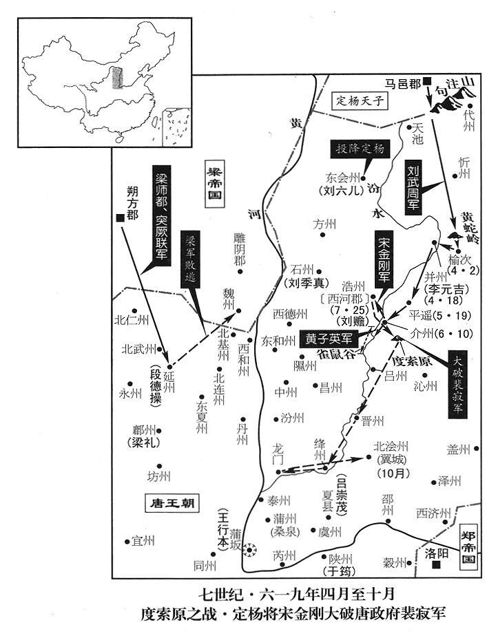 64、唐政府晋州道大军作战司令(晋州道行军总管)裴寂,出击定杨天子刘武周,进抵介休,宋金刚守城抵抗;裴寂驻军度索原(山西省灵石县东),饮用山涧溪水;宋金刚切断水源,唐军士卒无水可饮,开始干渴。裴寂打算把大营移到有水的地方,宋金刚挥军进攻,唐军崩溃,有的被杀,有的逃亡,几乎不剩一人,裴寂一天一夜功夫,骑马飞奔到晋州。