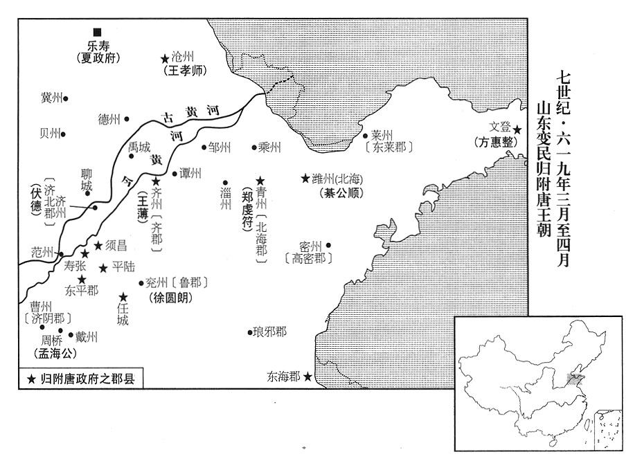 海岱(东海至泰山)变民首领徐圆朗呈献几个州的土地,向唐政府归降(徐圆朗据鲁郡“〔山东省兖州市〕”起兵,参考六一七年正月三十日)。唐政府命徐圆朗当兖州军区(鲁郡改兖州)总司令(兖州总管),封鲁国公。