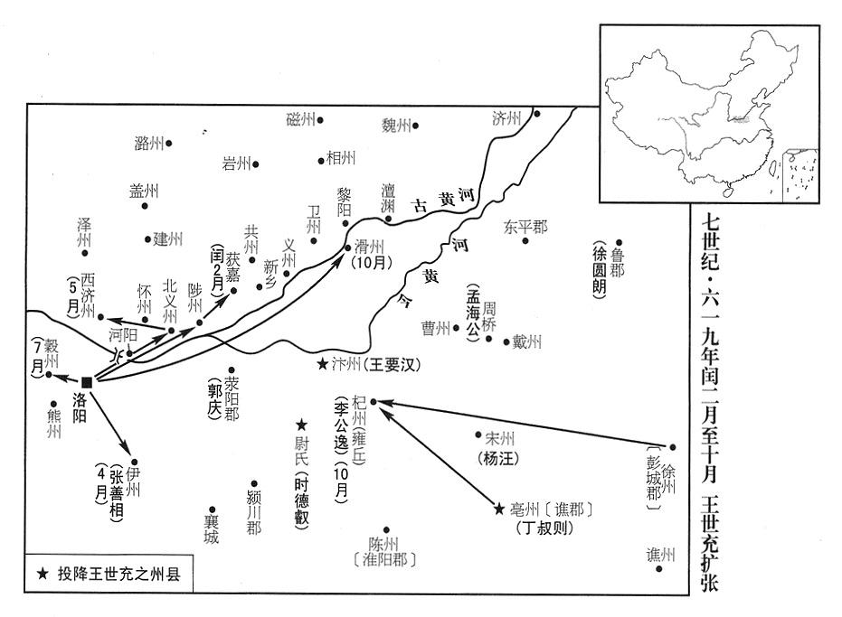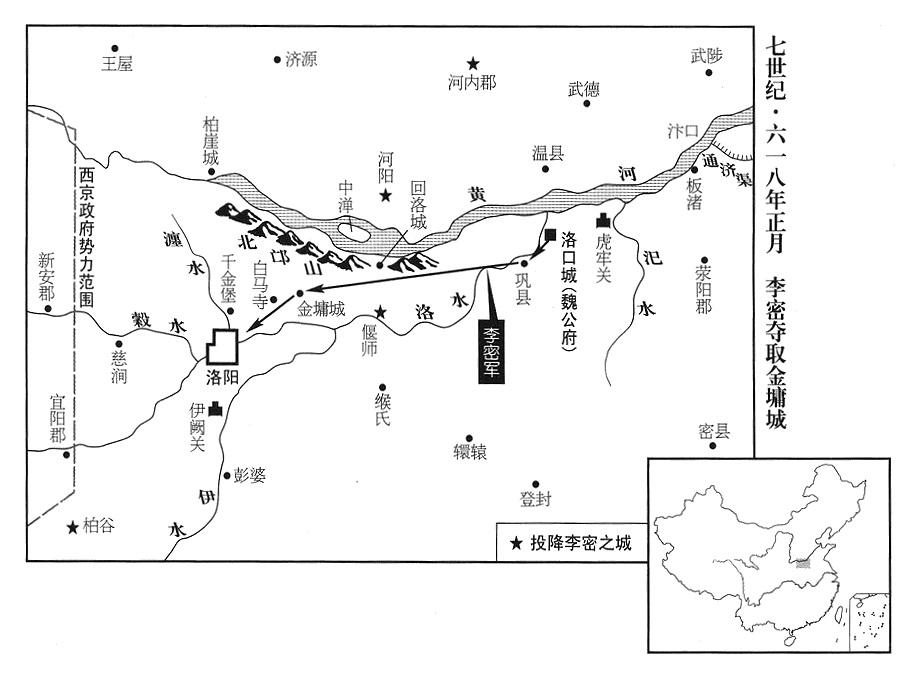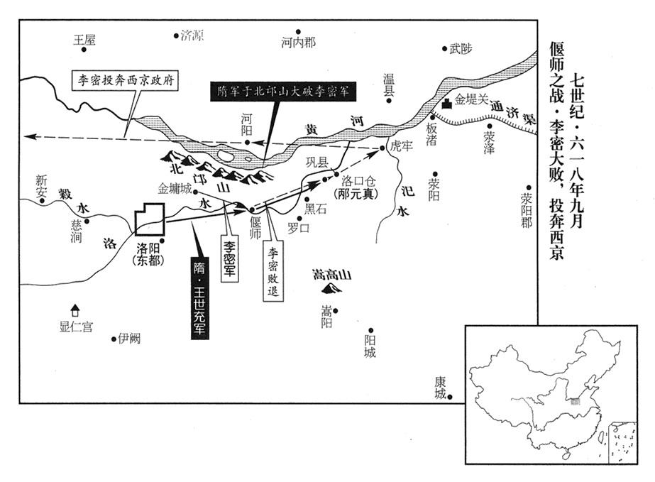 2、王世充既得到东都(洛阳·河南省洛阳市)军队(越王杨侗增援王世充十余万人,参考去年“〔六一七年〕”九月十一日),遂进攻洛北(洛水以北),击败魏公李密,向前推进,驻扎巩县(河南省巩县)北郊。