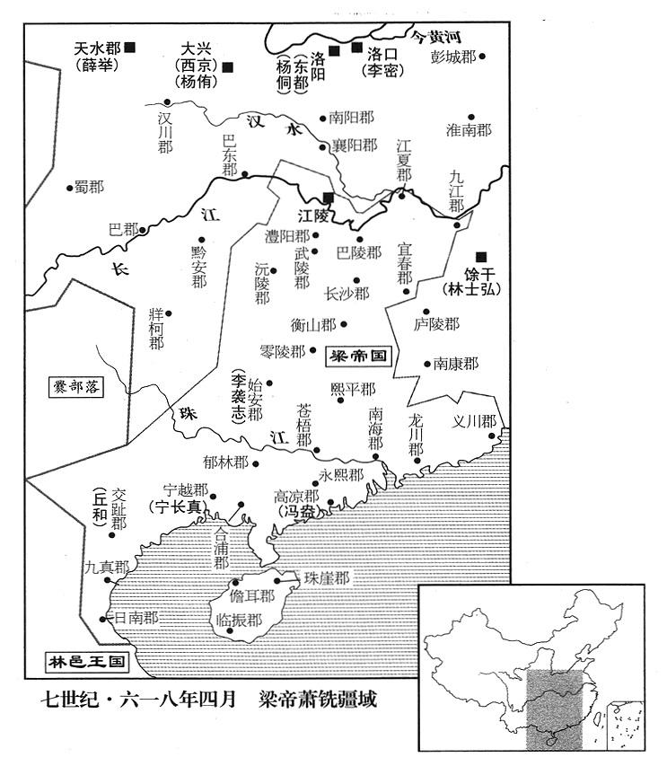 20、梁王萧铣(首都巴陵郡“〔湖南省岳阳市〕”)宣布称帝,设立文武百官,一切遵循南梁帝国典章制度。追尊叔父萧琮(南梁帝国末任“〔九〕”帝)谥号孝靖皇帝、祖父萧岩谥号河间(忠烈)王、老爹萧璿谥号文(宪)王。把董景珍等功臣七人都封王爵。派宋王杨道生攻击南郡(湖北省江陵县),攻克,遂迁都江陵(南郡郡政府所在县),整修南梁帝国旧有的皇家祖庙和皇家墓园(南梁自七任帝萧詧以降,都定都江陵,参考五五五年正月)。任命岑文本当立法院主任立法官(中书侍郎“〔南梁帝国的官制〕”),主管公私文书及政府机要。又派鲁王张绣前往岭南(南岭以南)夺取土地;隋政府将领张镇周、王仁寿等率军抵抗;但不久得到杨广被杀消息,就都向萧铣投降。钦州(广西钦州市)州长宁长真(参考五九七年冬季)也献出郁林郡(广西贵港市东)、始安郡(广西桂林市),归附萧铣。