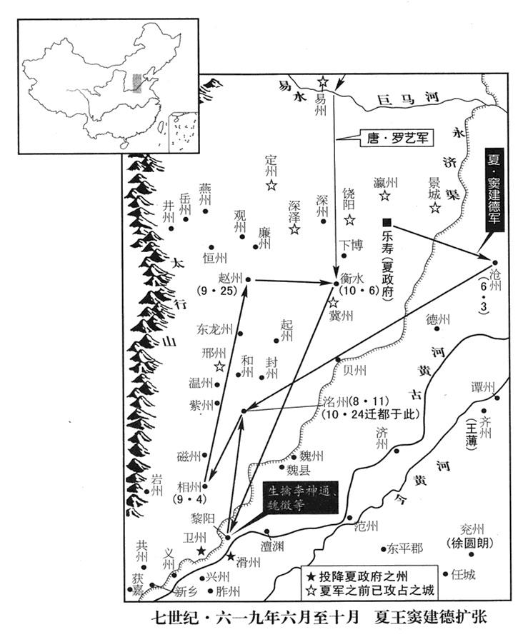 十月六日,李艺(罗艺)在衡水(河北省衡水市)击破夏王窦建德。