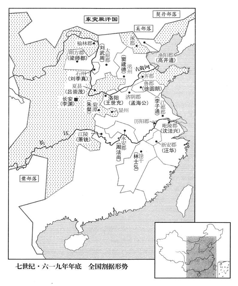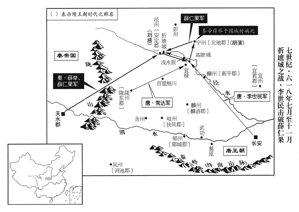 29、六月十日,秦帝薛举(首都天水)攻击唐政府所属泾州(甘肃省泾川县),李渊命秦王李世民担任元帅,率八个总司令(总管)的军队抵抗。