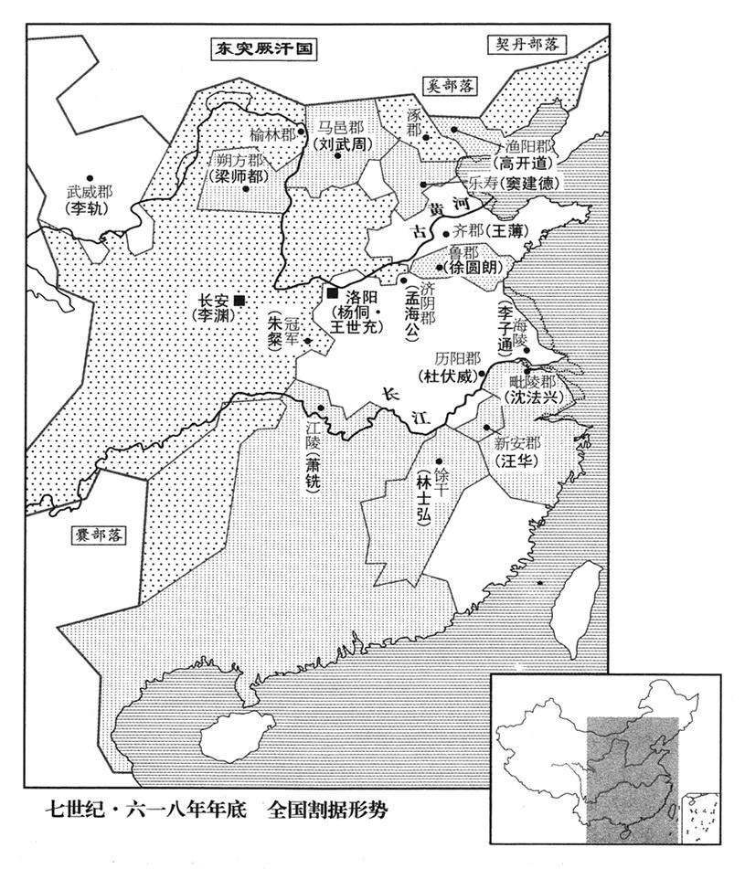 “隋·大业十四年义宁二年皇泰元年唐·武德元年(燕国漫天王王须拔四年)(秦帝薛举秦兴二年)(楚帝朱粲昌达元年)(秦帝薛仁果元年)(楚帝林士弘太平三年)(凉帝李轨安乐元年)(夏王窦建德丁丑二年·五凤元年)(梁帝萧铣鸣凤二年)(许帝宇文化及天寿元年)(魏公李密二年)(魏帝魏刀儿元年)(定杨天子刘武周天兴二年)(燕王高开道始兴元年)(梁帝梁师都永隆二年)(大乘帝高昙晟法轮元年)(永乐王郭子和丑平二年)”