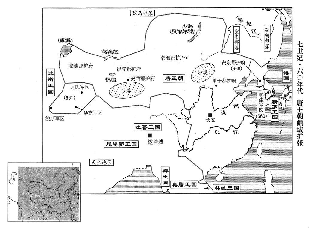 9、吐蕃王国(首都逻些城“〔西藏拉萨市〕”)和吐谷浑汗国(青海省)互相攻击,各派使节上疏唐政府,申诉理由,指责对方,并要求援助,李治都不允许。