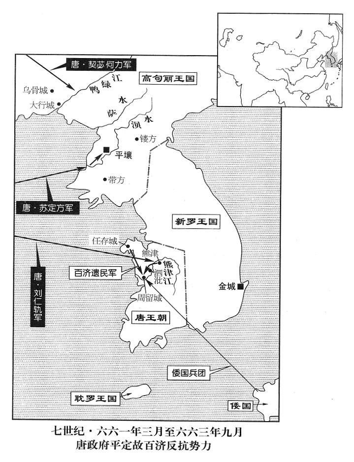4、最初,苏定方征服百济王国(首都泗沘“〔韩国扶馀市〕”),留贵族征兵府副司令(郎将)刘仁愿镇守百济首都泗沘城,又命左卫军(卫军第一军)贵族征兵府司令(中郎将)王文度当熊津军区(总部设韩国公州市)总司令,安抚亡国后的百济人民。王文度渡海接任后,即行逝世。百济王国佛教僧侣道琛、故大将扶馀福信聚众起兵,据守周留城(朝鲜半岛韩山城),派人到倭国(日本)迎接充当人质的王子扶馀丰回国继任国王(三十二任),把刘仁愿包围在故京泗沘城中。
