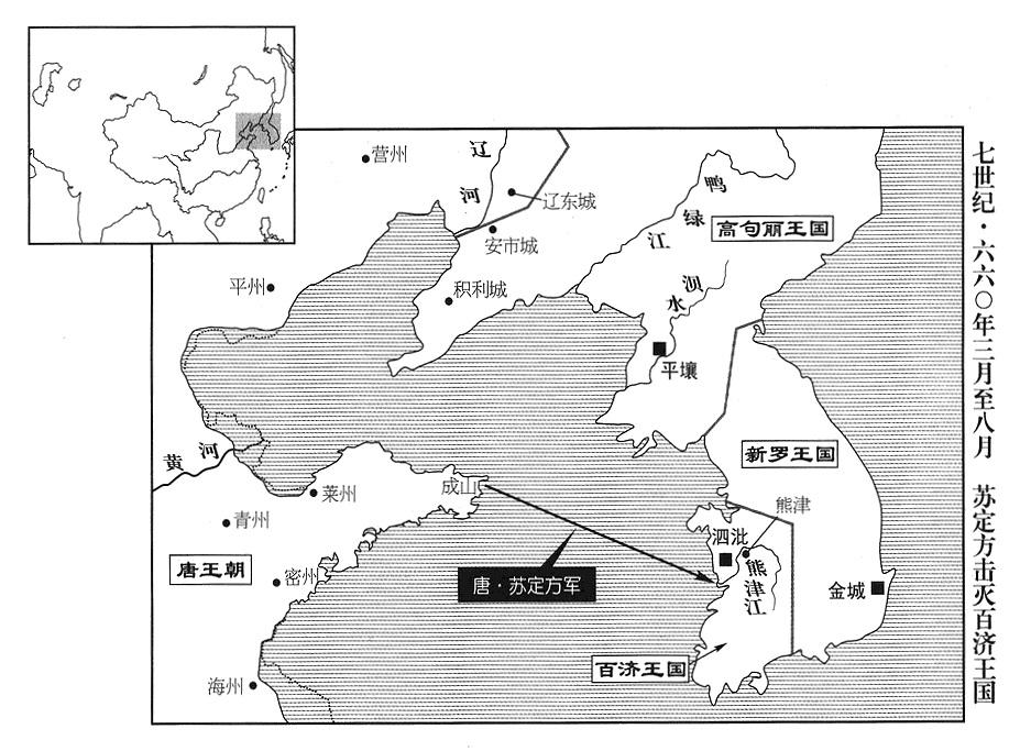 11、东方远征军苏定方率海军舰队自成山(山东省荣成市东北成山角)出港,横渡黄海,直航朝鲜半岛。百济王国大军固守熊津江(锦江)江口抗拒。远征军强行登陆,百济军数千人阵亡,残余军队全都溃散逃走。苏定方水陆两路同时并进,直扑首都泗沘城,距城还不足三十里,百济全国动员出战,苏定方攻击,大破百济军,杀一万余人,追击前进,进入外郭。