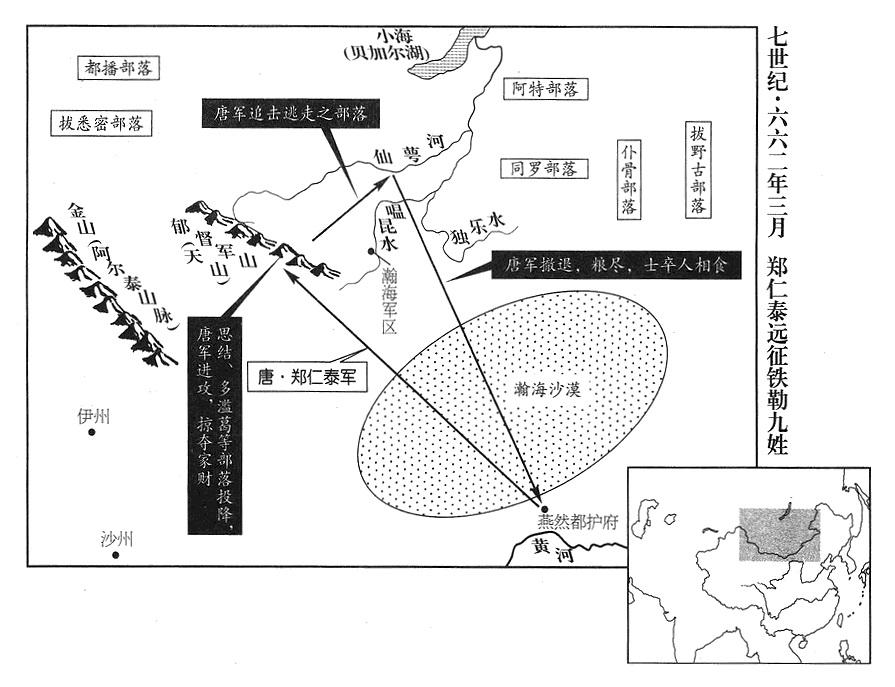 思结部落(蒙古国巴彦洪戈尔市)、多滥葛部落(蒙古国乌兰巴托市)等,早先就进入天山据守,听到郑仁泰等将要到达,全出来迎降;郑仁泰等却挥军攻击,掠夺他们的家财,作为犒赏,各部落相继逃走;将军杨志追赶,被逃走的部落联军击败。斥候骑兵报告郑仁泰说:“蛮虏的辎重就在附近,再往前走,就可掳获!”郑仁泰率轻装备骑兵一万四千人,急行兼程赶路,渡过庞大的碎石沙漠地带,抵达仙萼河(蒙古国色愣格河),竟看不见敌人踪影,而粮食已经吃完,只好撤退。偏逢天降大雪,士卒饥寒交迫,抛弃盔甲武器,杀马果腹,等到战马杀光,就互相格杀,吃对方的尸体;等到进入边塞,只剩下八百人(九九藏书网一万三千二百人饿死、冻死、或被自己战友呑食,只为了将领贪图财物,人间惨事)。