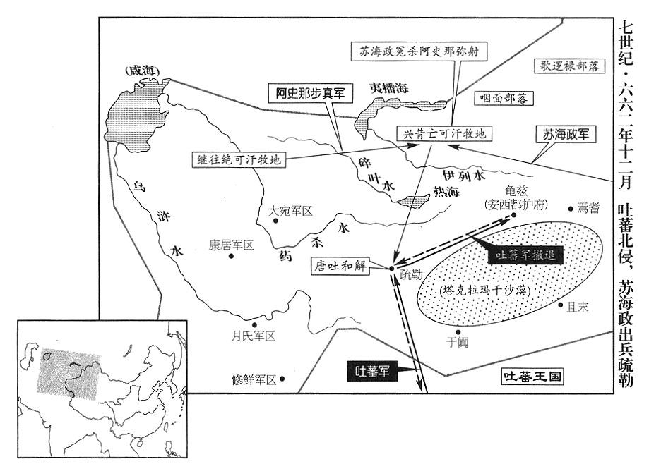 20、西方远征军䫻海兵团总司令(䫻海道行军总管)苏海政(䫻,音yù“〔玉〕”),奉命讨伐龟兹王国(新疆库车县)。唐帝李治命西突厥汗国(新疆东北部及中亚东部)兴昔亡可汗(十二任大可汗)阿史那弥射、继往绝可汗(十三任大可汗)阿史那步真出军支援。苏海政进入阿史那弥射国境,阿史那步真跟阿史那弥射一直互相仇恨(参考六五七年十二月),于是向苏海政告密说:“阿史那弥射谋反,请快诛杀。”当时苏海政直辖部队只有数千人,紧急召开军事会议,讨论说:“阿史那弥射如果叛变,我们一个活口都剩不下、不如先行下手。”乃宣称接到皇帝诏书,命总司令官(大总管)携带绸缎数万段(四匹为一段),赏赐可汗及所有酋长。阿史那弥射率领他的部属前来领取赏赐,苏海政把他们一网打尽,全部诛杀,只有鼠尼施部落(新疆新源县境)、拔塞幹部落(今地不详)逃走,苏海政与阿史那步真联军追击,扫平。