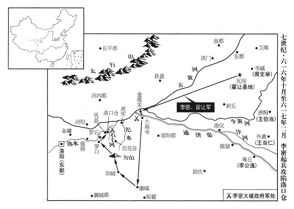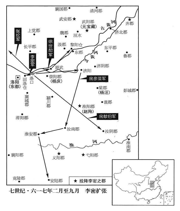 徐世勣建议李密说:“天下大乱的原因,不过是人民饥馑。我们如果能夺取黎阳仓,大事就可成功。”李密派徐世勣率部众五千人,自原武(河南省阳原县西南原武镇)北渡黄河,会同元宝藏、郝孝德、李文相以及洹水县(河北省魏县西南)变民首领张升、清河郡(河北省清河县)变民首领赵君德,共同袭击黎阳仓,攻克,立即据守,大开仓门,由饥民任意取食,十天左右,就集结到战士二十余万。武安郡(河北省永年县东南旧永年镇)、永安郡(湖北省新洲县)、义阳郡、弋阳郡(河南省光山县)、齐郡(山东省济南市),前后相继投降李密。甚至窦建德(时在乐寿)、朱粲(时在山南“〔秦岭以南〕”一带),已经称王的变民军首领,也都派使节归附李密。李密命朱粲当扬州军区(总部设江苏省扬州市)总司令(扬州总管),封邓公。