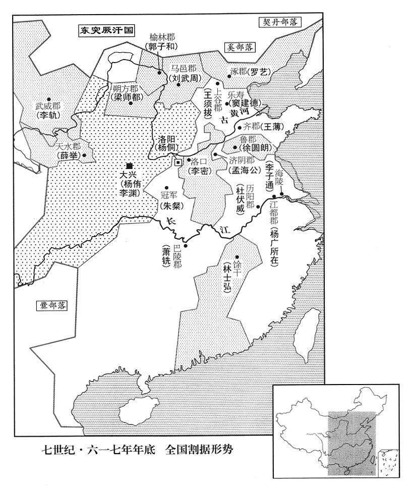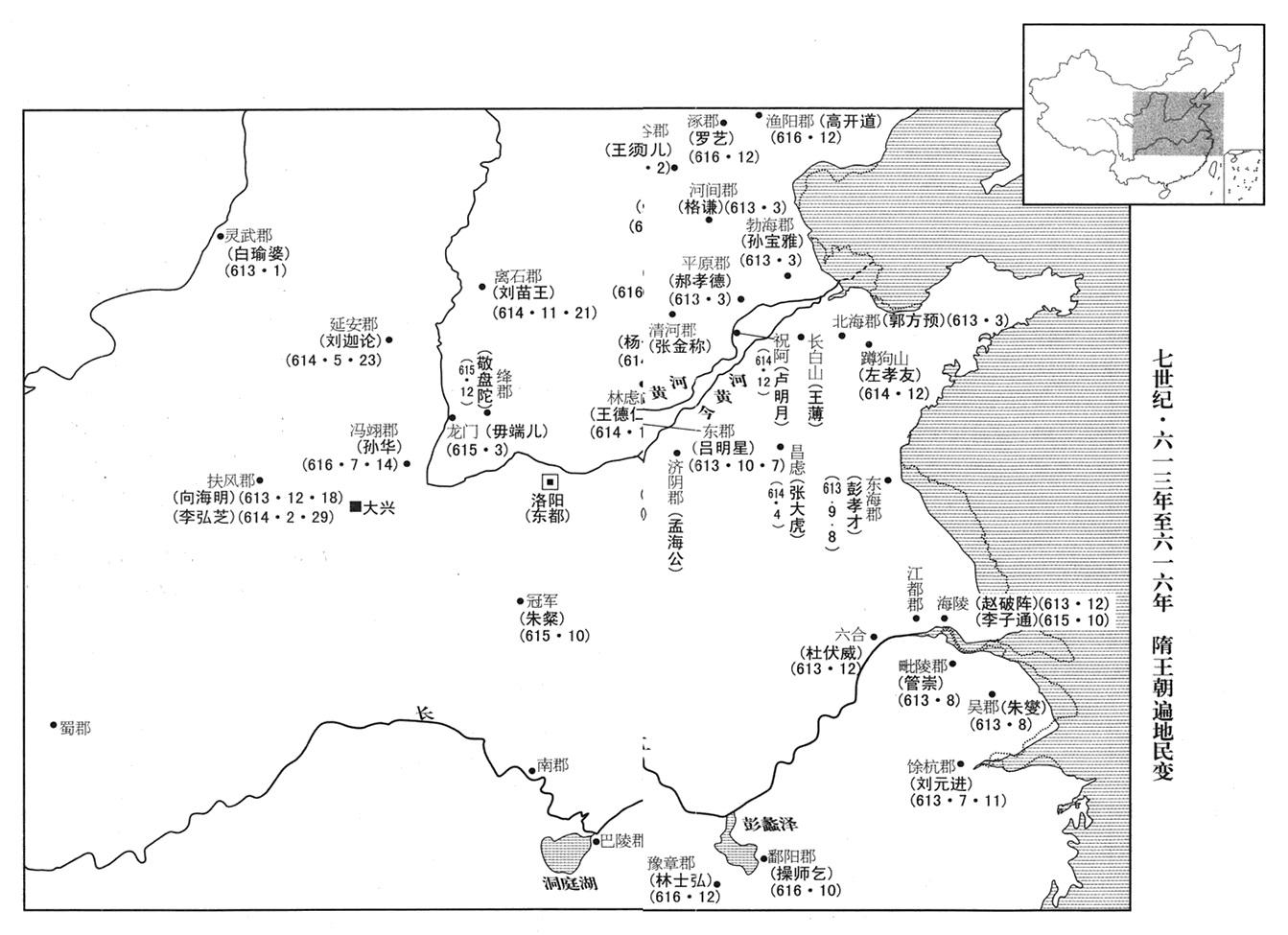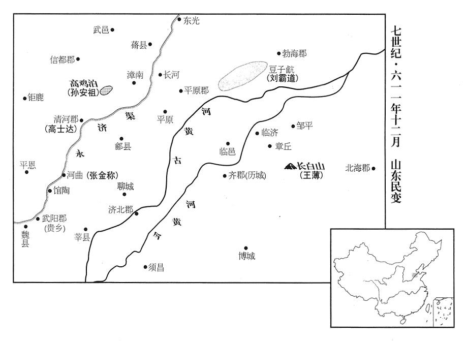10、全国各地民变蜂起:齐郡(山东省济南市)人王薄、孟让,北海郡(山东省青州市)人郭方预,清河郡(河北省清河县)人张金称,平原郡(山东省陵县)人郝孝德,河间郡(河北省河间市)人格谦,勃海郡(山东省阳信县)人孙宣雅,各自聚众起兵,西出抢劫。人数多的有十余万,少的也有数万,山东(崤山以东)人民水深火热。