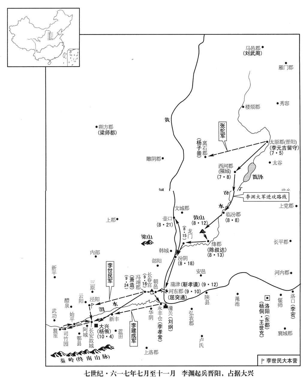 九月十八日,李渊派世子李建成、军政官(司马)刘文静,率王长谐等各军数万人,进驻永丰仓,把守潼关,防备东方军队;慰劳特使(慰抚使)窦轨等受他节制。敦煌公李世民,率刘弘基等各军数万人,前往渭北(渭水以北)地区,夺取土地;慰劳特使殷开山等受他节制。窦轨,是窦琮的老哥(窦综,参考本年四月)。
