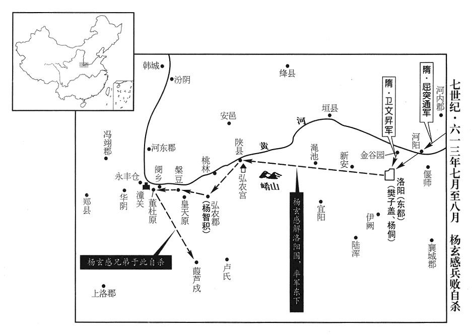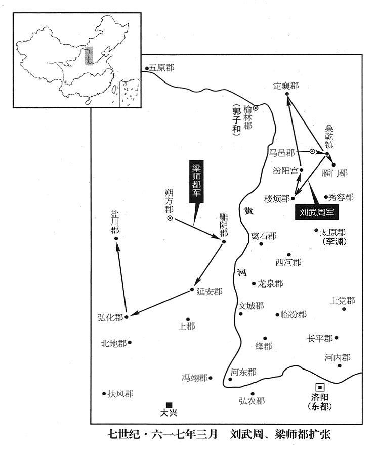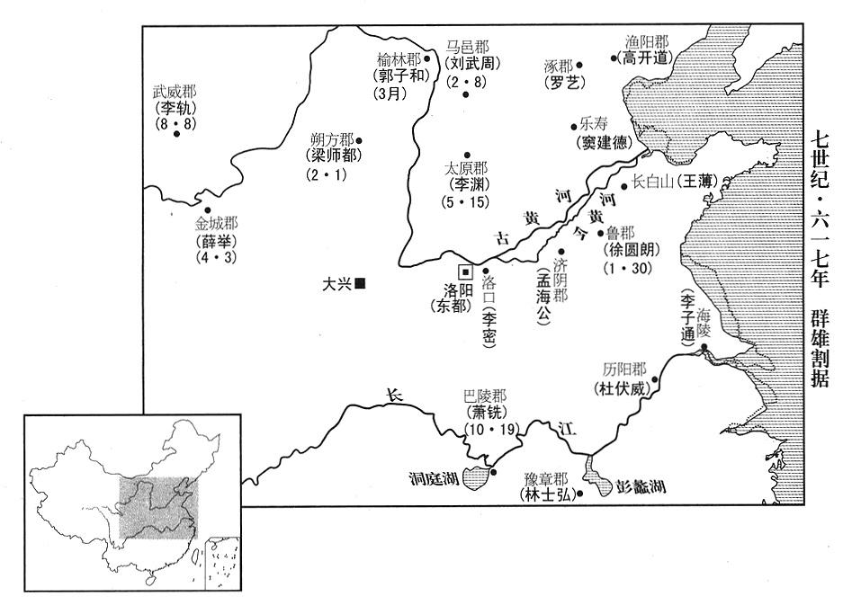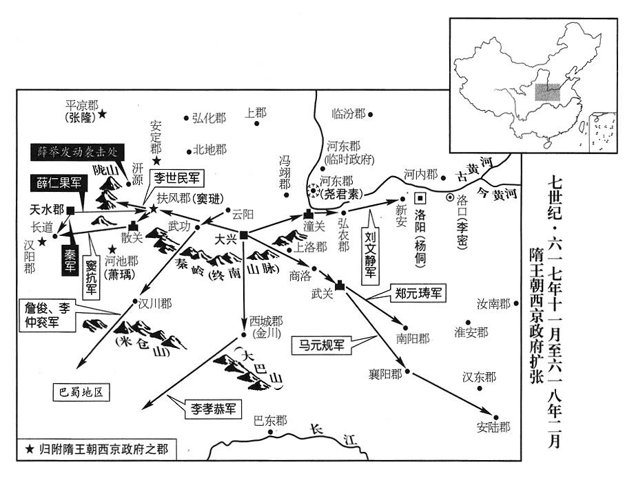 40、十二月十九日,平凉郡(宁夏固原县)留守长官张隆;十二月二十一日,河池郡(陕西省凤县)郡长萧瑀,以及扶风郡、汉阳郡(甘肃省礼县南),前后相继归附西京政府(三任帝杨侑)。