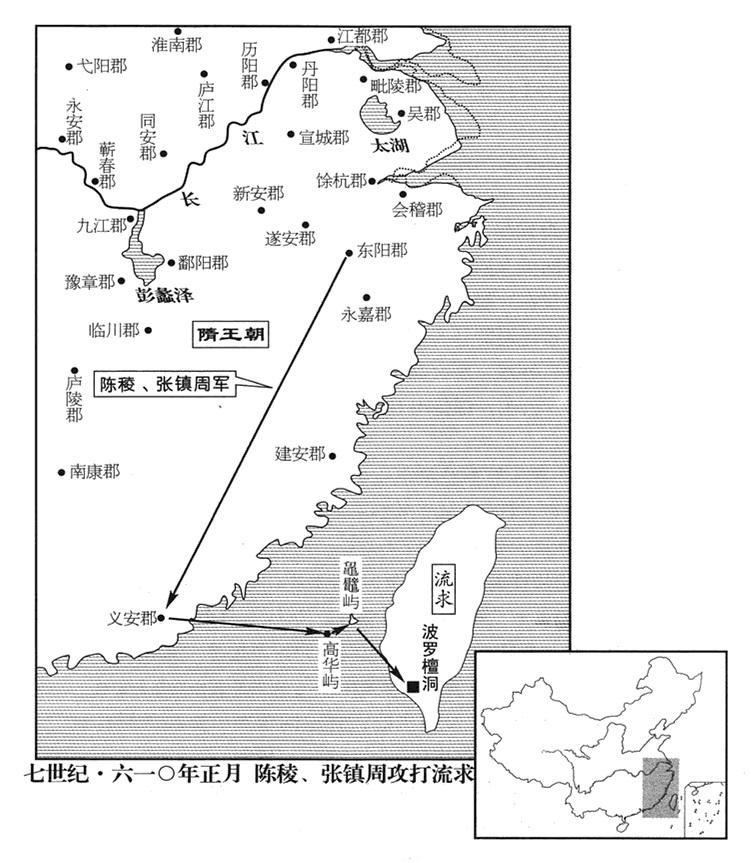 3、杨广再派朱宽前往流求(台湾岛)安抚招降,流求居民拒绝。杨广派虎贲指挥官(虎贲郎将·十六禁军府副将军)庐江郡(安徽省合肥市)人陈稜、朝请大夫(九大夫之八·正五品)同安郡(安徽省潜山县)人张镇周征调东阳郡(浙江省金华市)民兵一万余人,从义安郡(广东省潮州市)乘船舰出海攻击。航行一月余,抵达流求,张镇周当先锋,登陆前进,流求王渴刺兜派军迎战。张镇周不断击败流求军,进抵流求首都(婆罗檀洞·台湾省屏东县恒春半岛境),渴剌兜亲自率军阻截,又被击败,遂退回营寨。陈稜等乘胜进攻,攻克,斩渴剌兜,俘虏住民一万余人,班师。