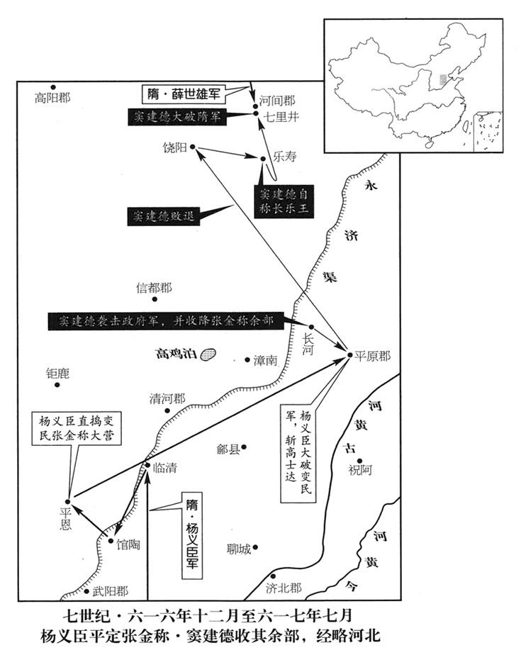 当时,还有鄃县(山东省夏津县)人张金称在河曲(永济运河弯曲处·应在河北省临西县一带)聚众起兵。蓨县(河北省景县)人高士达在清河郡(河北省清河县)境内,集结变民,四出抢掠。郡县政府疑心窦建德跟变民军勾结,逮捕窦建德的家人,全部屠杀。(《新唐书·窦建德传》:“群盗来往漳南杀人放火,打家劫舍,却从不进入窦建德住的那条街,因此郡县政府认定他跟盗城私通。)窦建德率部属二百人逃亡,投奔高士达。高士达自称东海公,命窦建德当大营军事参议官(司兵)。不久,孙安祖被张金称诛杀,孙安祖的部众全投靠窦建德,武装战士多达一万余人。窦建德礼贤下士,跟士卒同甘共苦,因此人民争着归附,愿为他牺牲性命。