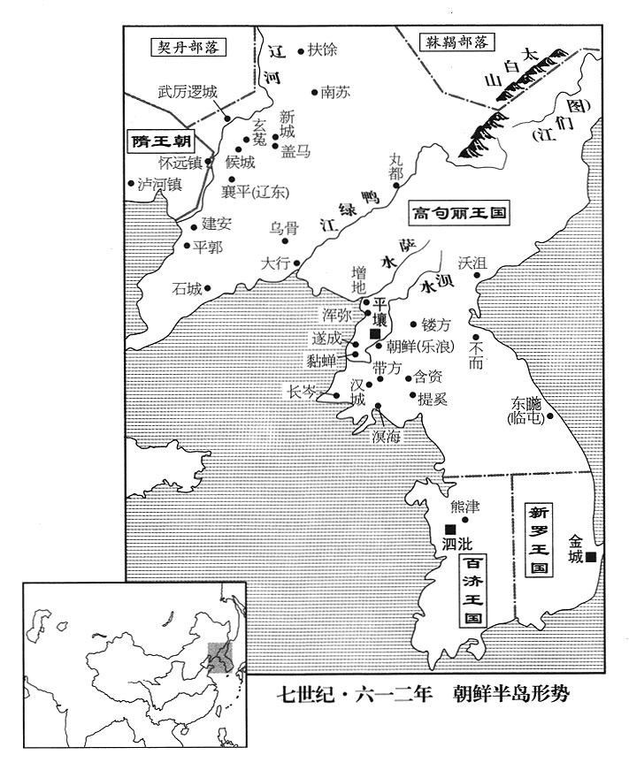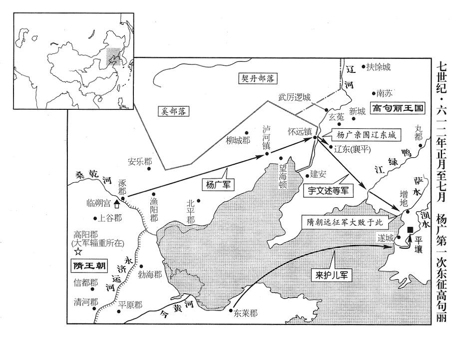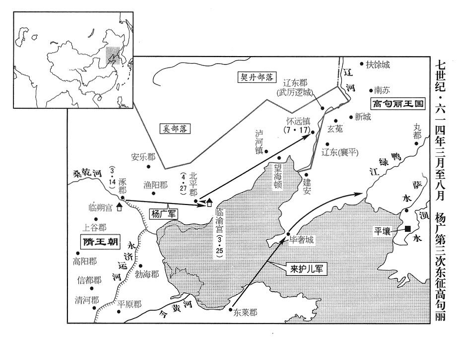 1、春季,正月二日,隋王朝(首都大兴“〔陕西省西安市〕”)皇帝(二任炀帝)杨广(本年四十五岁)下诏,征召全国军队再到涿郡(北京市)集合。开始募集勇士组军,美称“骁果”(“骁果”似是七世纪流行的形容词,形容英雄人物勇敢善战)。并修筑辽东古城,用以储备军粮。(自秦王朝直至大分裂时代后燕帝国,辽东郡政府设襄平城“〔辽宁省辽阳市〕”,后燕帝国末期,郡政府侨迁至和龙城“〔辽宁省朝阳市〕”附近,襄平在东,和龙在西。高句丽军据守古襄平,杨广重修的是侨郡城。)