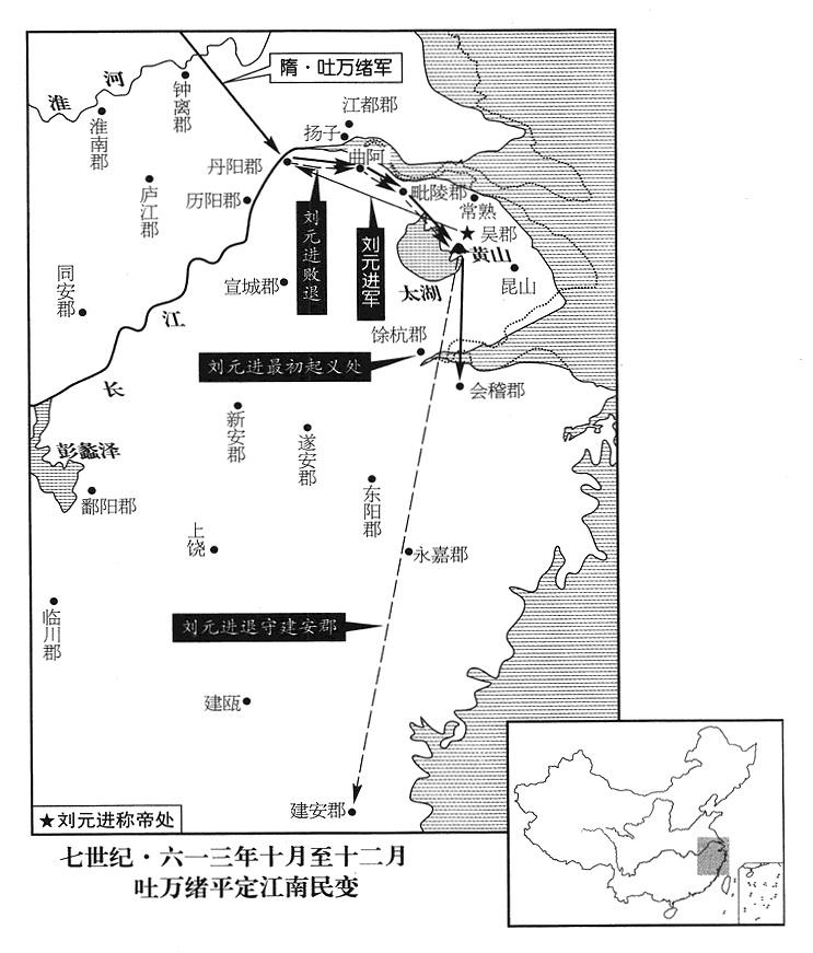 47、十二月二十九日,方与(山东省鱼台县)变民首领张善安攻陷庐江郡(安徽省合肥市),渡长江南下,前往豫章郡(江西省南昌市)投奔已称楚帝的林士弘(参考去年“〔六一六年〕”十二月),林士弘怀疑张善安来意不善,把他安置在南塘(南昌市南),张善安怨恨,发动偷袭,击破林士弘军,纵火焚烧豫章城郭,退走。林士弘迁都南康郡(江西省赣州市)。